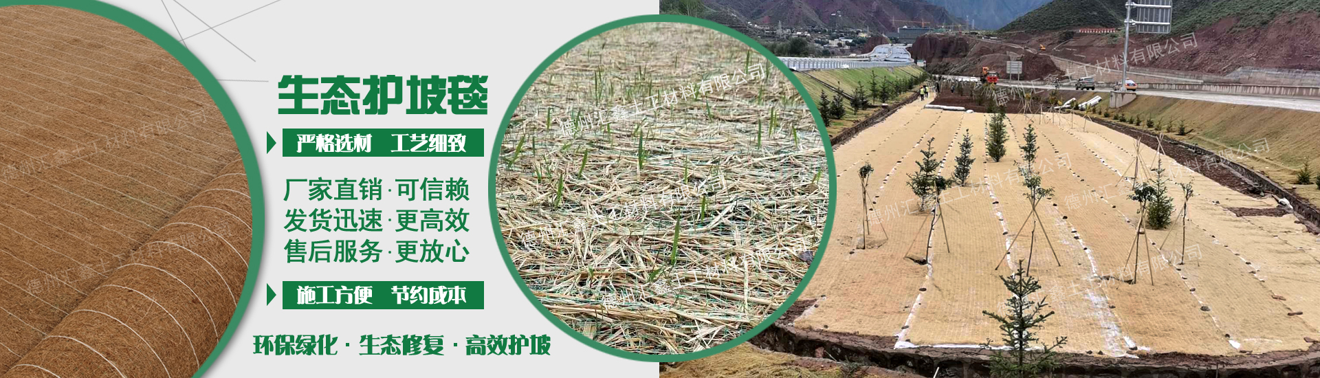 德州匯鑫土工材料有限公司是一家專業生態護坡產品、技術服務及施工為一體的綜合性企業。公司主要生產銷售植物纖維毯、植生毯、椰絲毯、抗沖生物毯、生態毯、秸稈纖維毯、麻椰固土毯、塑筋水保抗沖椰墊、生態袋、植生袋等各種護坡材料,產品廣泛應用于:高速公路邊坡綠化、山體邊坡綠化護坡、河道邊坡、人工湖邊坡防護及其他生態邊坡治理等工程。經廣大工程單位使用證明,產品質優價廉,施工方便,售后服務好,得到廣大客戶的一致好評。 "為客戶提供優質產品及服務"的宗旨, 熱誠希望攜手各界朋友,共鑄造彼此輝煌。 ...